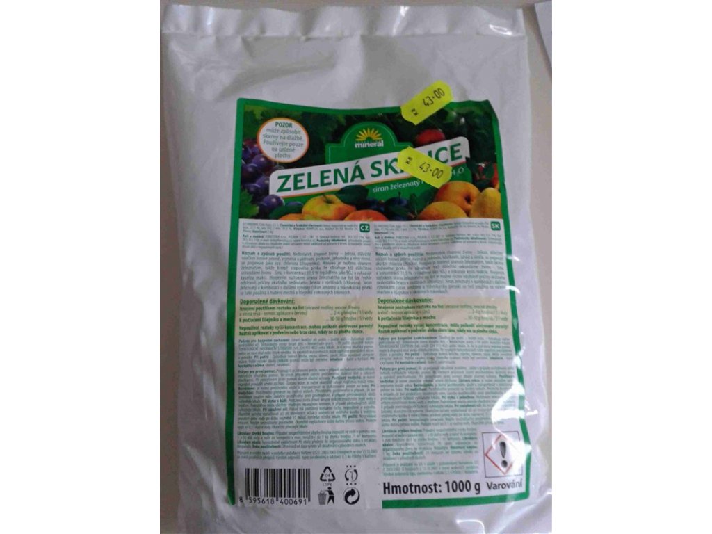 Skalice zelená - železo je důležitou součástí listové zeleně-chlorofylu. Jeho nedostatek se zejména u jádrovin, peckovin, jahodníku a révy vinné projevuje jako tzv. chloróza /žloutenka/. Hnojivo má kyselou reakci. Síran železnatý umožňuje hnojit postřikem na list.Odstraní příčiny akutního nedostatku železa v rostlinách/chlorózu/. Hnojivo má herbicidní vlastnosti, nesmí být proto použito jinak, než je uvedeno na etiketě ! Síran železnatý v kombinaci se síranem amonným a trávníkářským pískem se také používá k hubení mechů a lišejníků v okrasných trávnících. Hnojení postřikem na list provádíme brzy ráno nebo večer nikoliv za plného slunce v dávce přibližně 2-4 g na 1litr.